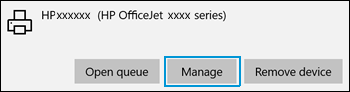 - From the list of available printers, choose the name of your printer and then choose the Manage option.